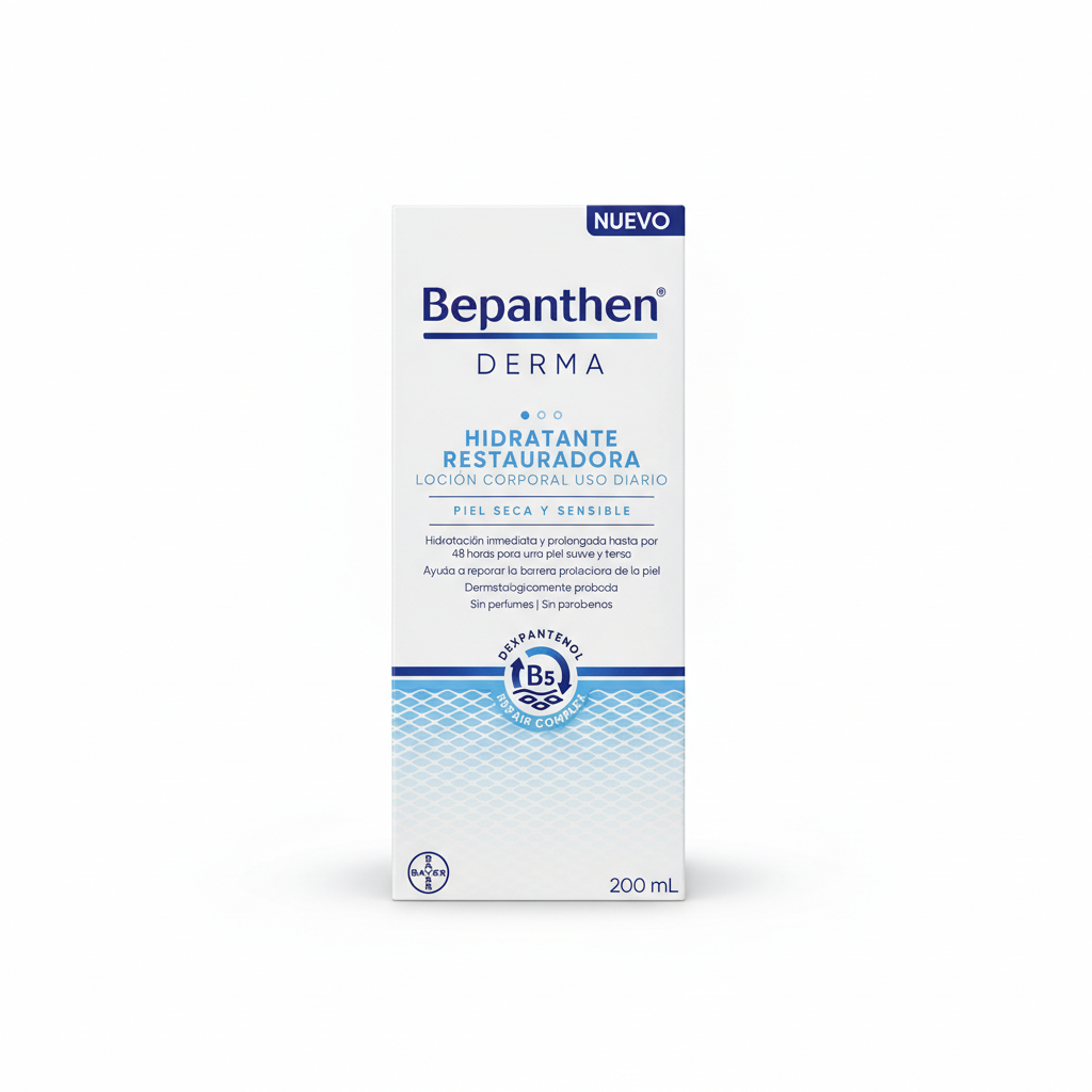 Bepanthen Derma Crema Hidratante Restauradora (200 ml) es una loción corporal de uso diario específicamente formulada para el cuidado intensivo de la piel seca y sensible. Su fórmula avanzada no solo proporciona una hidratación profunda e inmediata, sino que actúa restaurando activamente la barrera cutánea natural dañada, aliviando la sensación de tirantez y picazón. Gracias a una combinación sinérgica de activos reparadores como el Dexpantenol (Provitamina B5) y la Niacinamida (Vitamina B3), junto con lípidos naturales emolientes, fortalece la capacidad de la piel para retener la humedad y recuperar su confort, suavidad y flexibilidad.